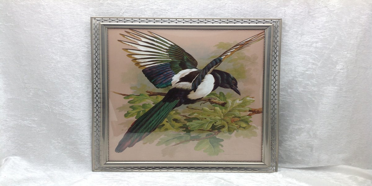 Indrukwekkende afbeelding van een ekster in een eikenboom, geschilderd door de Engelse vogelschilder Basil Ede (1931 – 2016), zie signatuur rechtsonder. Het betreft een reproductie.